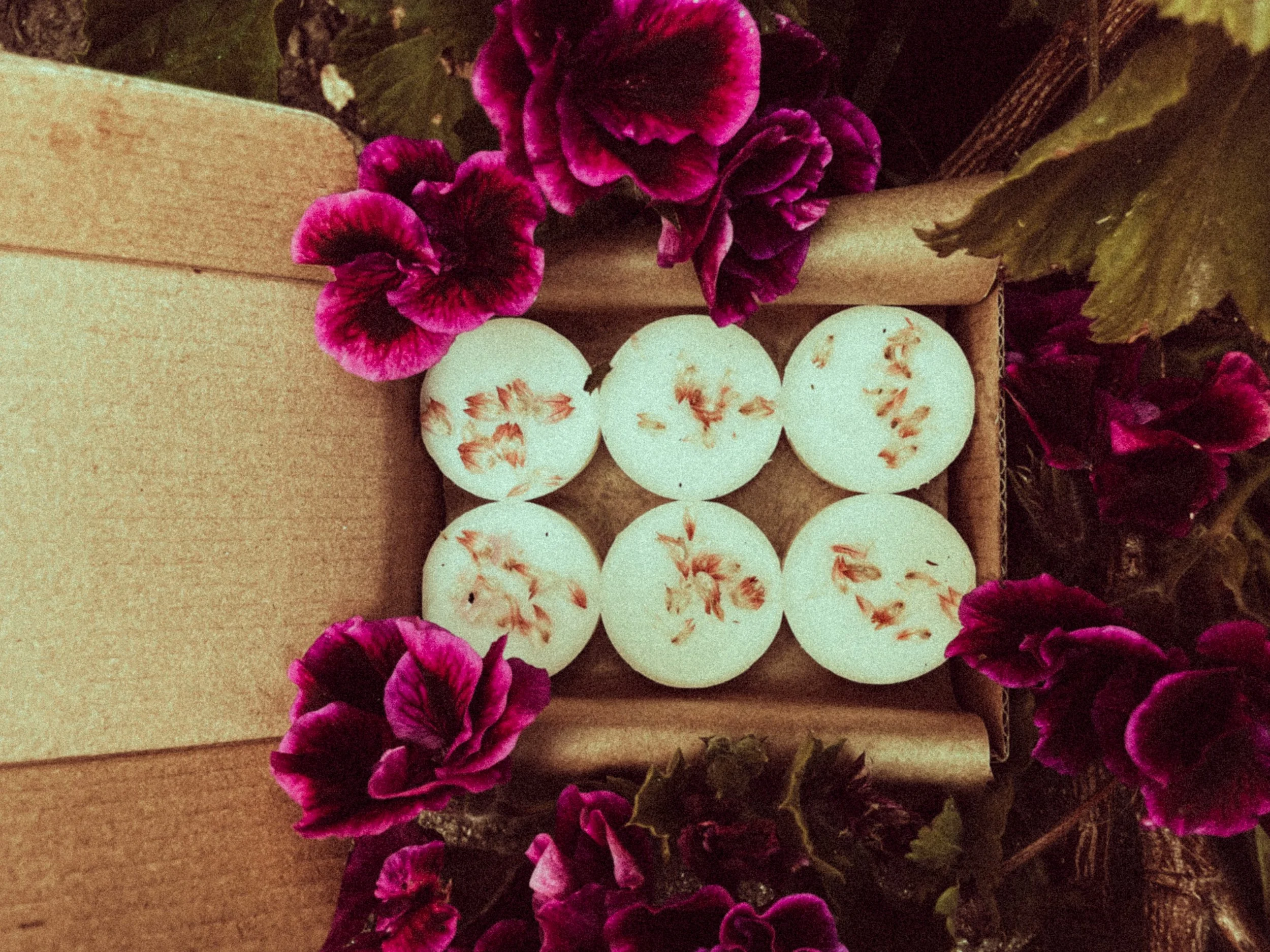 BOX: 12 melts are packed inside a kraft box, topped with a wax seal, with wax paper interwoven between the layers to protect your melts!